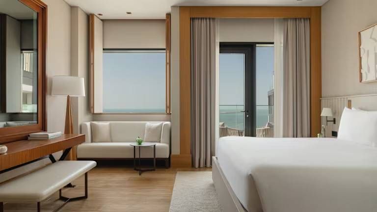 Delano Dubai, Bluewaters is a refined island retreat that balances contemporary design with a relaxed, resort-like ease. Set just offshore from the city, it feels quietly removed yet effortlessly connected, offering sweeping views across the Arabian Gulf with Dubai’s skyline shimmering in the distance. The aesthetic is clean and considered, with light-filled spaces, soft textures and a calm palette that invites you to slow the pace.